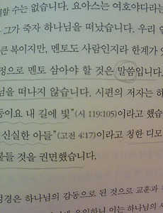 전체 글102 [발췌/기독교][누가 왕인가? 中] 우리가 진정으로 멘토 삼아야 할 것은 "말씀"입니다. 책제목 : 누가 왕인가? - 믿음으로 반응하라지은이 : 김병삼출판사 : 두란노 [누가 왕인가? 中] 우리가 진정으로 멘토 삼아야 할 것은 "말씀"입니다. #01 우리가 진정으로 멘토 삼아야 할 것은 말씀입니다. 말씀을 멘토 삼아야 하나님을 떠나지 않습니다. 시편의 저자는 하나님의 말씀이 "내 발에 등이요 내 길에 빛" (시 119:105)이라고 했습니다. 바울은 "내 사랑하고 신실한 아들" (고전 4:17)이라고 칭한 디모데에게 하나님의 말씀을 붇틀 것을 권면했습니다. #02 모든 성경은 하나님의 감동으로 된 것으로 교훈과 책망과 바르게 함과 의로 교육하기에 유익하니 이는 하나님의 사람으로 온전하게 하며 모든 선한 일을 행할 능력을 갖췌 하려 함이라 (딤후 3:16-17) [누가 왕인가?, 김병삼, 14.. 2015. 3. 5. [발췌/기독교][누가 왕인가? 中] 성경이 말하는 리더는 철저하게 하나님과 백성을 섬기는 리더입니다. 책제목 : 누가 왕인가? - 믿음으로 반응하라지은이 : 김병삼출판사 : 두란노 [누가 왕인가? 中] 성경이 말하는 리더는 철저하게 하나님과 백성을 섬기는 리더입니다. #01 신명기 17장 14절 이하에는 이스라엘 백성이 가나안에 들어가 만일 왕을 세운다면 왕에 대한 규범은 이러해야 한다고 설명하고 있습니다. 첫째, 병마를 많이 두지 말며(16절), 둘재, 아내를 많이 두거나 은금을 쌓지 말며(17절), 셋째, 율법서를 제사장이 보는 앞에서 기록하고(18절), 넷째, 말씀을 평생에 옆에 두고 읽어 여호와 경외하기를 배우며 모든 하나님의 말씀을 지켜 행하라(19절)고 합니다. 어떻습니까? 성경이 말하는 리더는 군림하는 리더가 아닙니다. 철저하게 하나님과 백성을 섬기는 사람이 성경적 리더입니다.... [누가 .. 2015. 3. 4. [발췌/기독교][누가 왕인가? 中] 내가 일하면 내 수준에 그치지만, 하나님이 일하시면 하나님의 수준으로 완성됩니다 책제목 : 누가 왕인가? - 믿음으로 반응하라지은이 : 김병삼출판사 : 두란노 [누가 왕인가? 中] 내가 일하면 내 수준에 그치지만, 하나님이 일하시면 하나님의 수준으로 완성됩니다 #01 위험이 닥쳤을 때, 위기 가운데 있을 때 나는 무엇을 붙잡습니까? 흔히 기도할 때 "주여!" 하고는 "도와주소서"라고 기도하는데, 이것이 과연 맞는 말일까요? 하나님은 도와주시는 분이 아닙니다. 우리도 모르는 사이, 자기가 뭔가 해보려다가 잘 안 되면 사후 약방문 식으로 하나님을 뒤치다꺼리나 하는 분으로 만들지는 않습니까? 내가 애쓰는 이 일을 하나님께 도와 달라고 하면 하나님은 도우시는 수준에 그칠 것입니다. 그러나 하나님이 내 안에 오셔서 사시고, 그 하나님이 직접 일하신다면 하나님의 놀라운 기적을 체험하게 될 것입.. 2015. 3. 4. [발췌][믿음이 만든 사람 中] 인생의 기근에 대처하는 세 가지 유형 책제목 : 믿음이 만든 사람지은이 : 강준민출판사 : 두란노 [믿음이 만든 사람 中] 인생의 기근에 대처하는 세 가지 유형 #01"인생의 기근에 대처하는 데는 크게 세 유형이 있습니다. 첫 번째는 끈기 있게 기근에 직면하는것입니다. 자신에게 찾아온 고통스러운 상황을 피하지 않고, 그 어려움을 주님 앞에 내어 놓고 주님과 함께 문제를 해결하려 합니다. 두번째 유형은 상황을 부인해 버립니다. 그리고 세 번째 유형은 기근이라는 상황으로부터 도피합니다. 그러나 참된 승리를 거머쥐려면 문제로부터 도망치는 것이 아니라 문제에 직면해야 합니다." [믿음이 만든 사람, 강준민, 56p] 어려움이 닥쳐오면 나는 상황을 부인하거나 도피하는 유형의 사람이 아닐까? 누구나 그러고 쉽고, 또한 그렇게 선택을 하게 되겠지만, 진.. 2015. 2. 28. 이전 1 ··· 19 20 21 22 23 24 25 26 다음